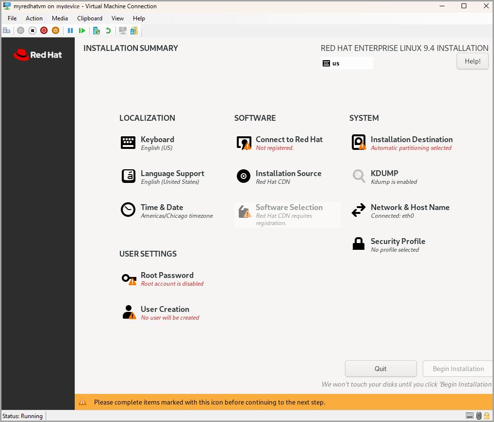 - Connettersi a una macchina virtuale e installare il sistema operativo Red Hat