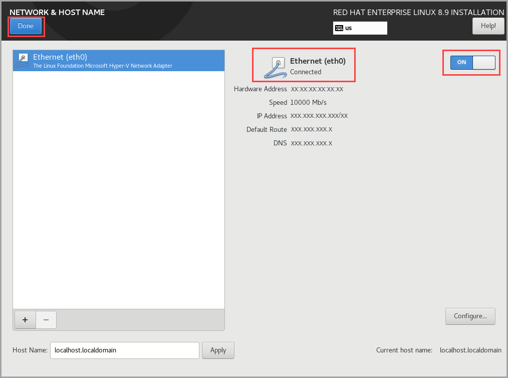 Abilitare il commutatore ON per l'interfaccia di rete e quindi selezionare Fine.