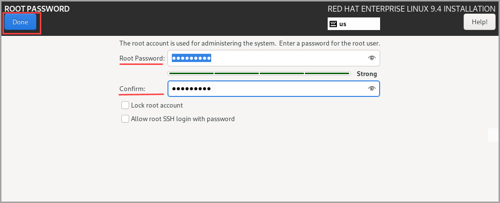 Selezionare Impostazione utente e impostare la password radice. Immettere una password, confermare la password e selezionare Fine.