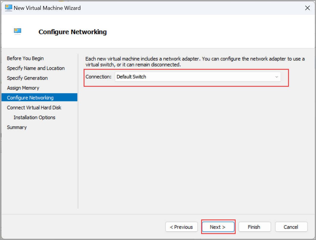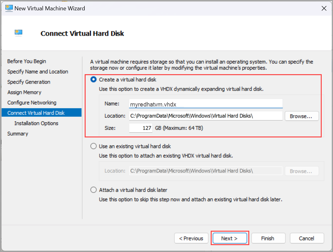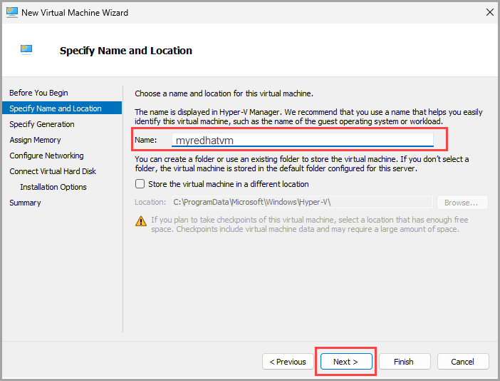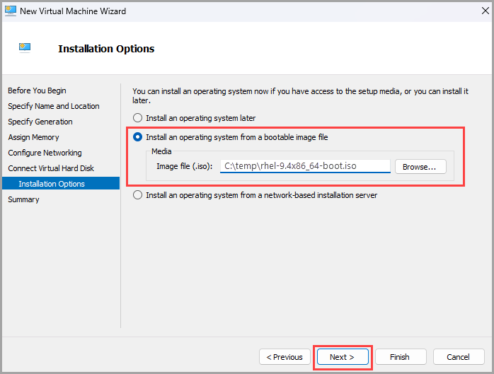 Nella Creazione guidata di una nuova macchina virtuale in Hyper-V, configurare le impostazioni per creare la VM Red Hat Enterprise.