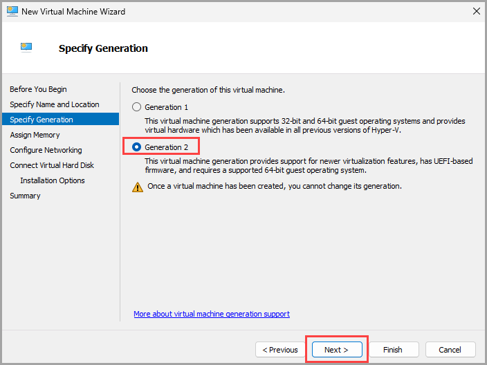 Specificare Generazione 2 per la macchina virtuale poiché si lavora con un'immagine di disco rigido virtuale v2 (VHDX).