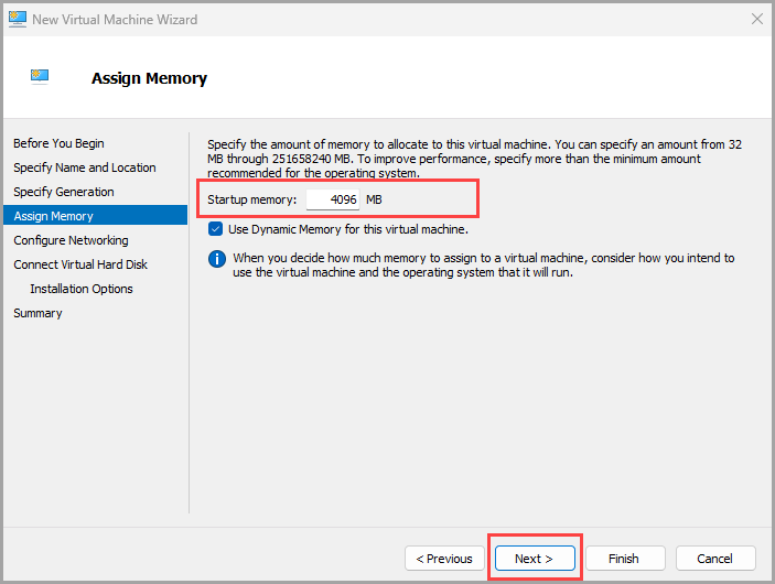 Selezionare Assegna memoria e quindi immettere 4096 per Memoria di avvio.