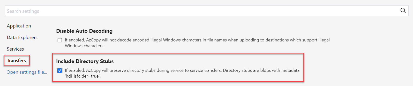 In Storage Explorer è possibile abilitare questo flag in Impostazioni selezionando Trasferisci e selezionando la casella Includi stub directory.