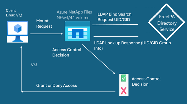 - Associazione/ricerca LDAP: Azure NetApp Files invia una richiesta di associazione/ricerca al server LDAP (FreeIPA, OpenLDAP o RHDS) usando UID/GID.