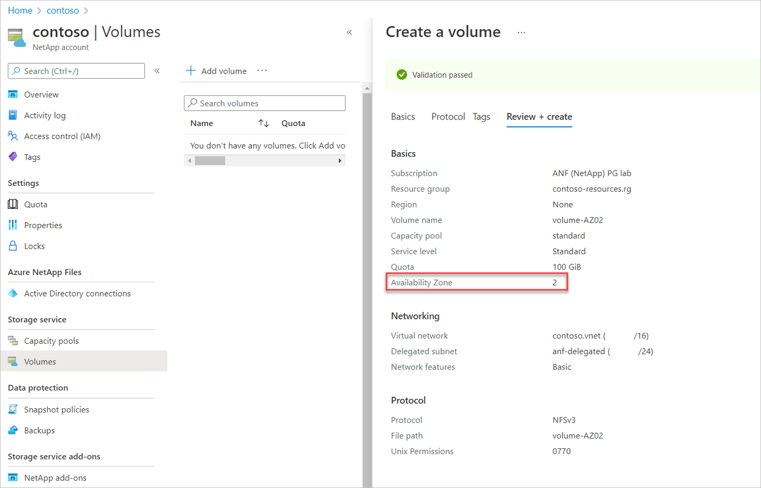 (Unavailable)e disattivate.Seguire l'interfaccia utente per creare il volume. La pagina Rivedi e crea mostra la zona di disponibilità selezionata specificata.