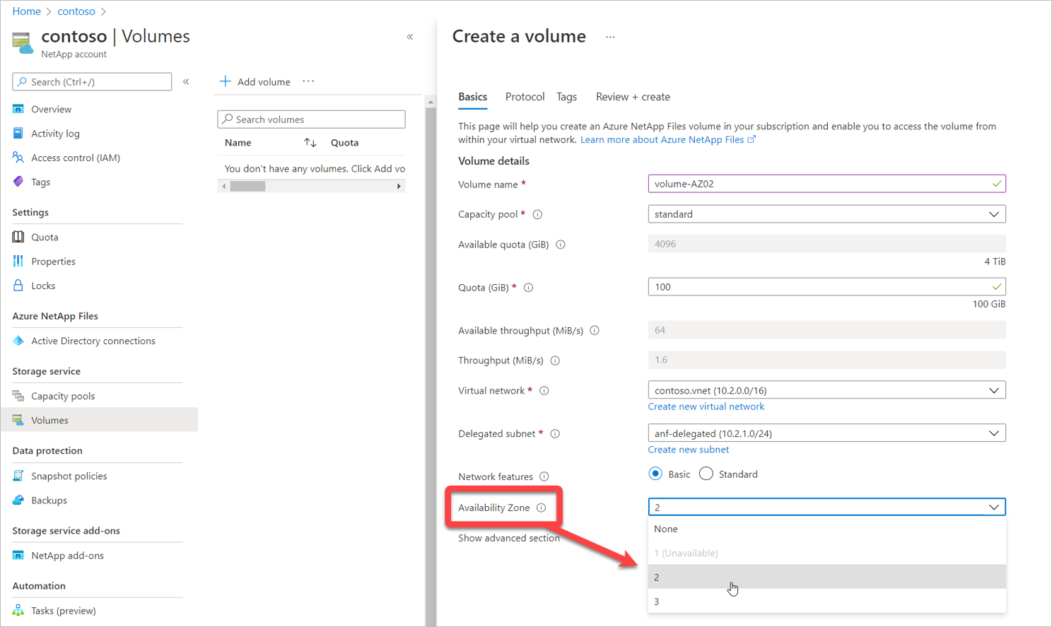 Nella pagina Crea un volume , nella scheda Basic selezionare il menu a discesa Zona di disponibilità per specificare una zona di disponibilità in cui sono presenti le risorse di Azure NetApp Files.