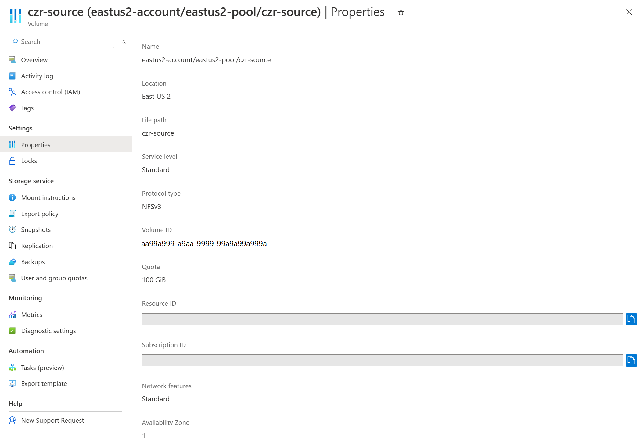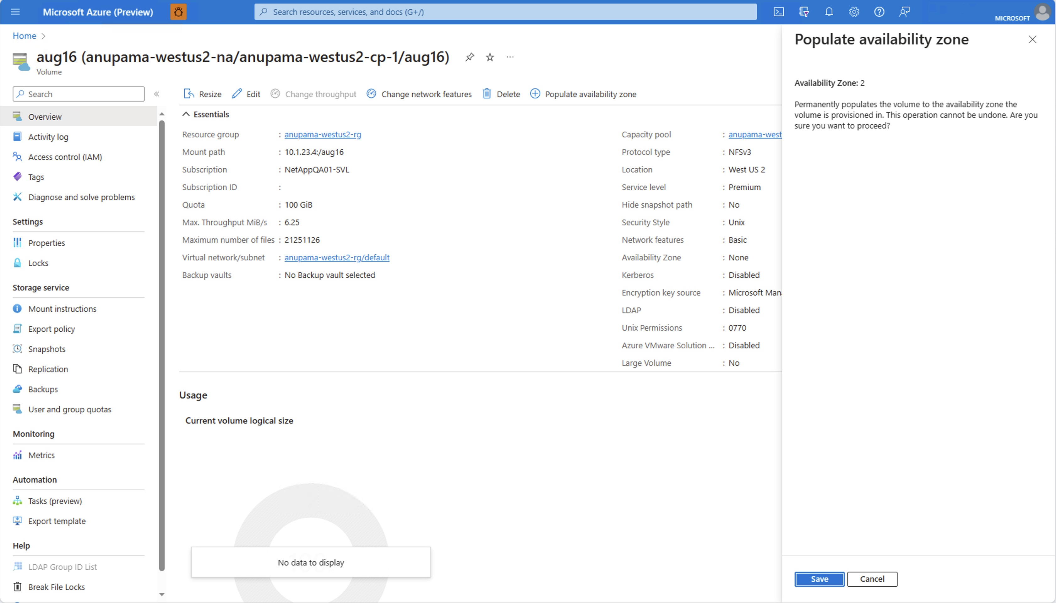 Le informazioni sulla zona di disponibilità possono essere popolate solo come specificato. Non è possibile selezionare una zona di disponibilità o spostare il volume in un'altra zona di disponibilità usando questa funzionalità. Se si vuole spostare questo volume in un'altra zona di disponibilità, è consigliabile usare la replica tra zone (dopo aver popolato il volume con le informazioni sulla zona di disponibilità).