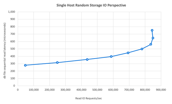 Il diagramma seguente mostra un carico di lavoro selezionato in modo casuale del 100% con un rapporto di riscontri nel buffer del database di circa l'8%. SLOB2 è stato in grado di guidare circa 850.000 richieste di I/O al secondo in tutti e tre gli host singolarmente. SLOB2 è stato in grado di eseguire questa operazione durante l'esecuzione in parallelo a un totale collettivo di circa 2.500.000 richieste di I/O al secondo con ogni host che mantiene comunque una latenza di eventi di lettura sequenziale del file db submillisecond. Con dimensioni del blocco di database pari a 8.000, si tratta di circa 20.000 MiB/s tra i tre host.