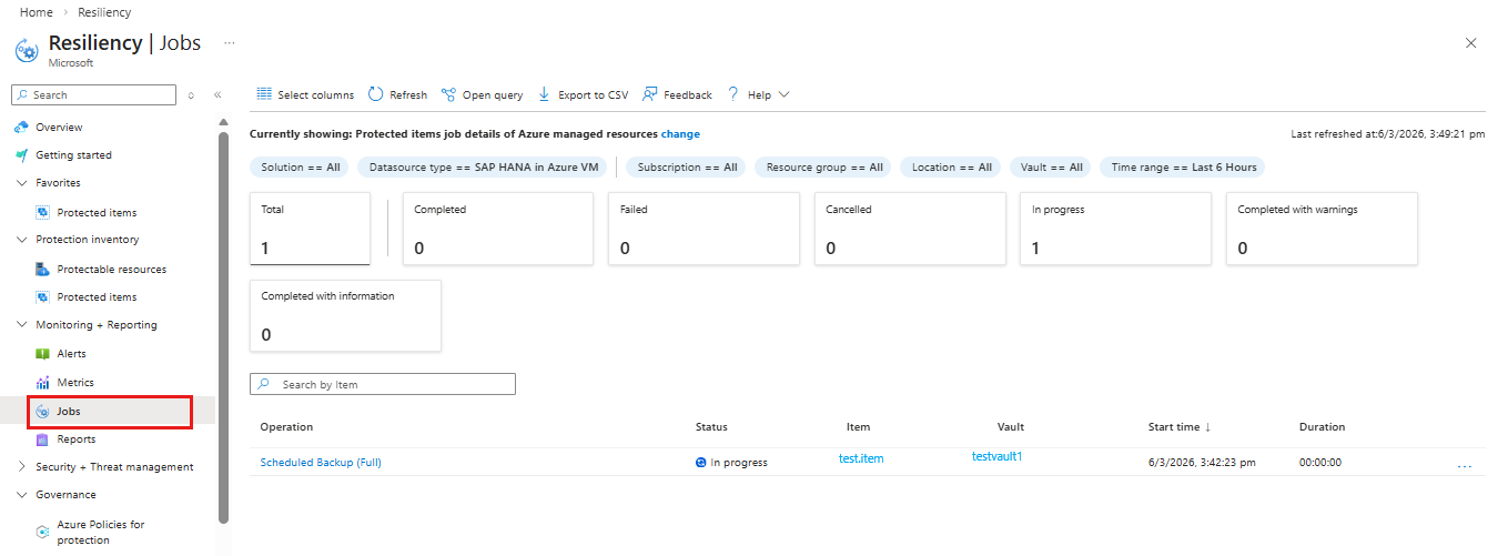 Azure Backup mostra tutti i processi attivati manualmente nella sezione Jobs di Resiliency.
