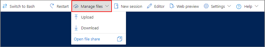 Il menu Gestisci file contiene elementi da caricare o scaricare file. Il pulsante Apri condivisione file apre la visualizzazione portale di Azure della condivisione file di Cloud Shell.
