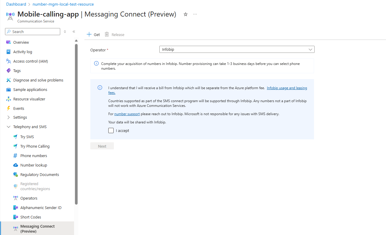 Il partner Messaging Connect determina la disponibilità del paese. Il partner Messaging Connect ,ad esempio Infobip, gestisce i tipi di numero, i requisiti di conformità e i passaggi di onboarding, che variano in base al paese.