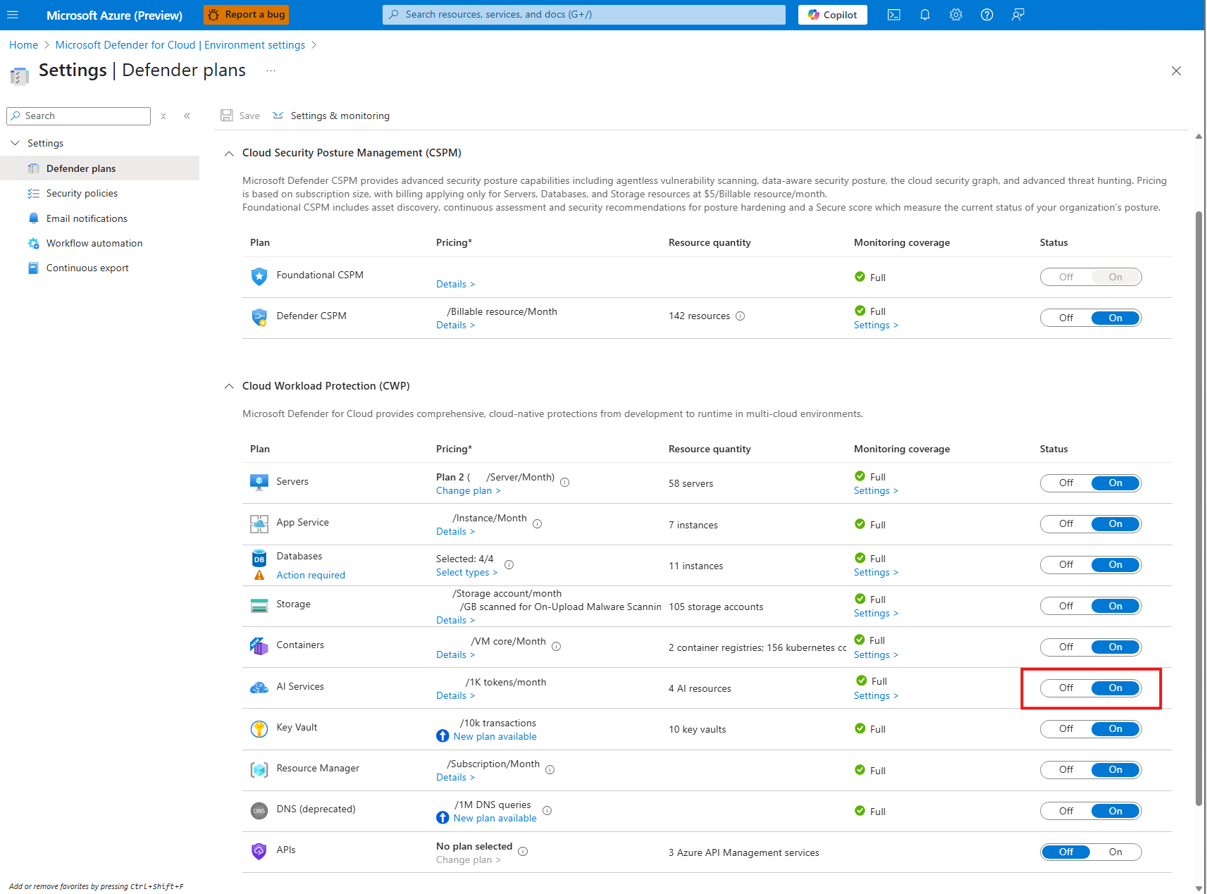 Nella pagina Piani di Defender attivare o disattivare i servizi di intelligenza artificiale su Sì.