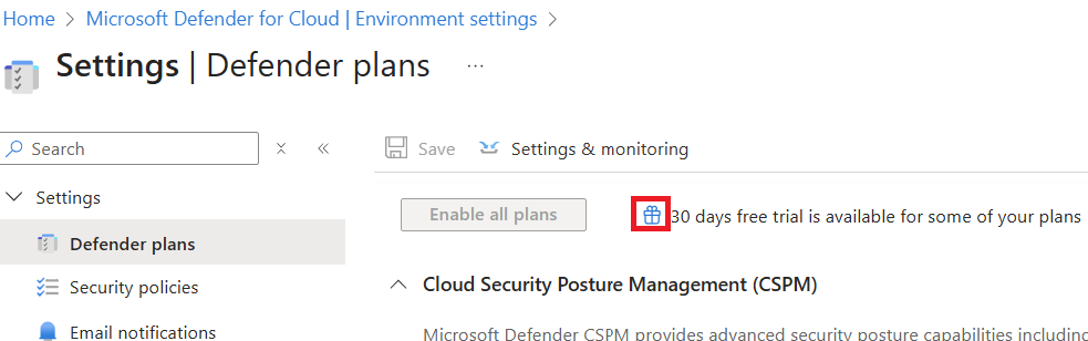 Quando si abilita Microsoft Defender for Cloud per la prima volta nella sottoscrizione di Azure, si avvia automaticamente una versione di valutazione gratuita di 30 giorni. Durante questo periodo di valutazione, è possibile esplorare le funzionalità di Defender for Cloud, foundational Cloud Security Posture Management (CSPM) e l'accesso a Microsoft Defender XDR.