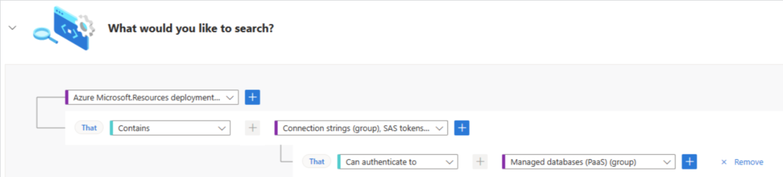 Creare una query per cercare i segreti nelle distribuzioni cloud. A tale scopo, selezionare un tipo di risorsa e quindi selezionare i tipi di segreto da trovare. Ad esempio: