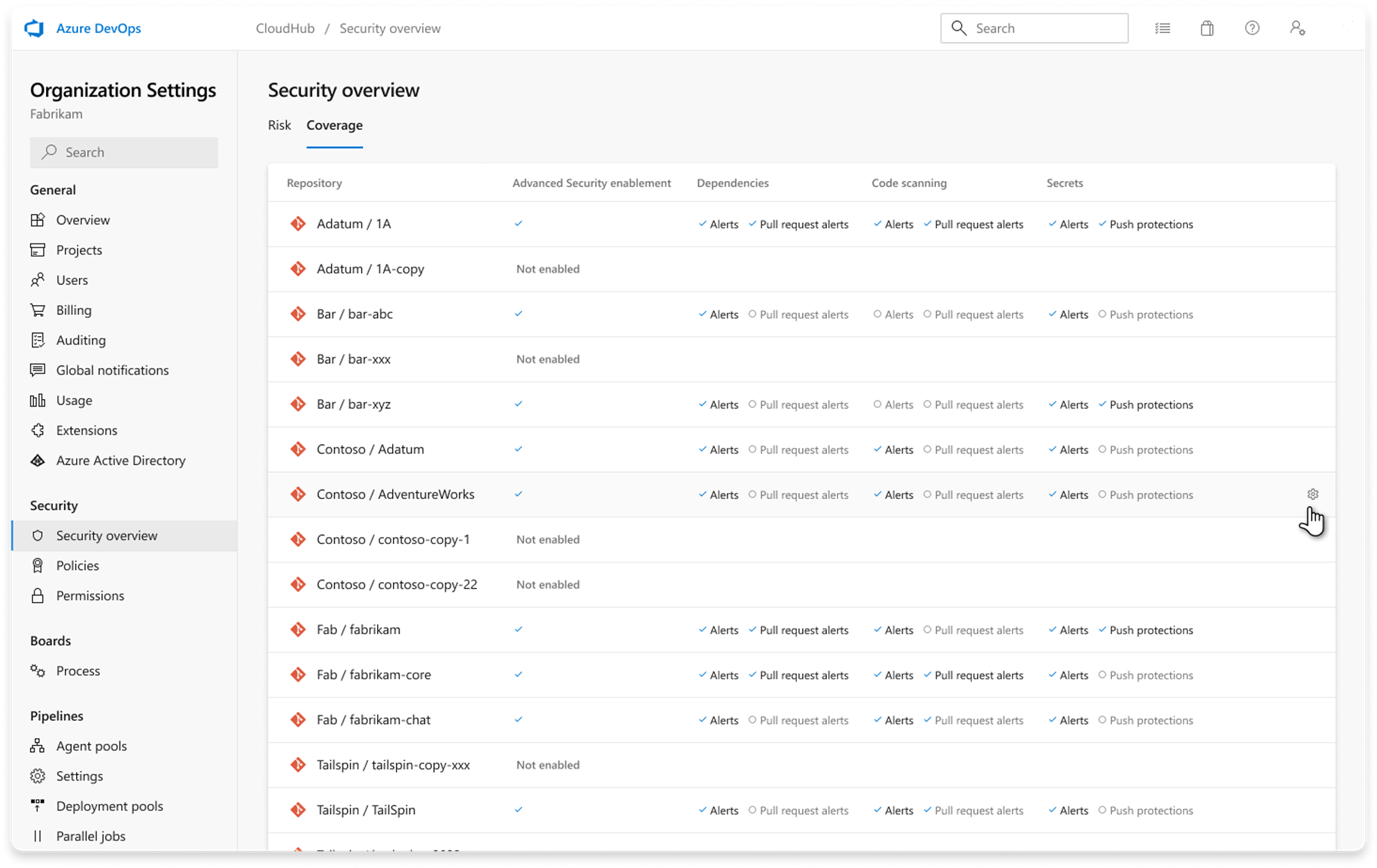 Con questo sprint si sta migliorando il flusso di lavoro DevOps con maggiore visibilità sulla sicurezza e flussi di lavoro della pipeline semplificati. GitHub Advanced Security include ora il rilevamento dettagliato dell'abilitazione per analisi delle dipendenze, l'analisi del codicee l'analisi dei segreti, offrendo informazioni più approfondite sulla copertura della sicurezza dell'organizzazione.