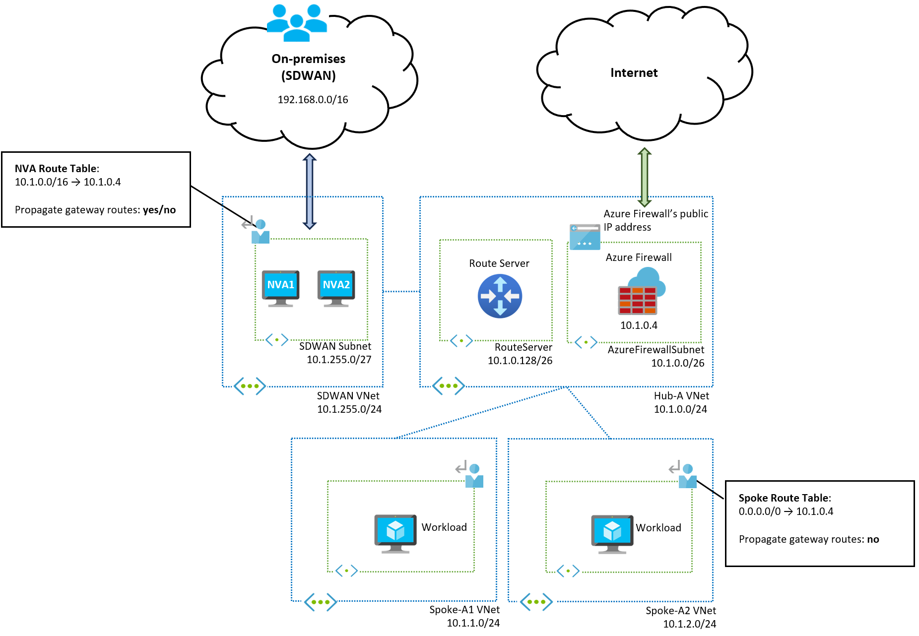 Esistono diversi modi per integrare appliance virtuali di rete SD-WAN in Azure. Per ulteriori informazioni, vedere integrazione SD-WAN con le topologie di rete hub-and-spoke di Azure. Questo articolo illustra l'integrazione con il server di route di Azure, uno dei metodi più comuni per il routing del traffico alle reti SD-WAN. Le appliance virtuali di rete SD-WAN annunciano i prefissi locali al server di route di Azure tramite BGP. Il server di route di Azure inserisce questi prefissi nella subnet di Firewall di Azure in modo che Firewall di Azure disponga delle informazioni di routing per le reti locali. Gli spoke non apprendono i prefissi on-premise perché l'opzione "Propagare le route del gateway" è disabilitata nella tabella di route degli spoke.