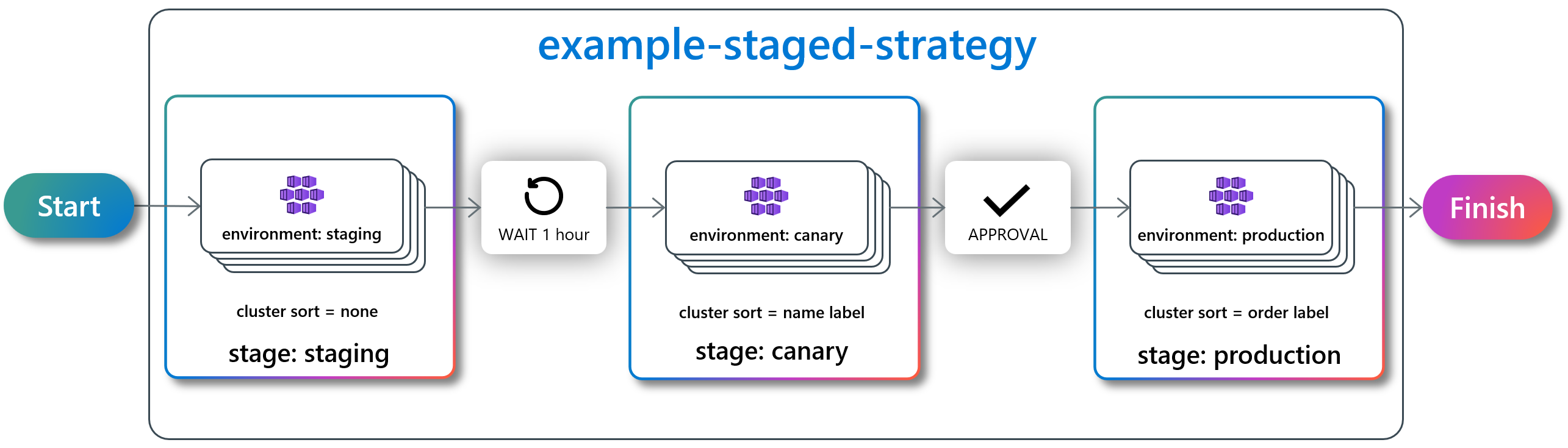 La strategia di aggiornamento a fasi fornisce un controllo granulare sulle implementazioni delle risorse organizzando i cluster in fasi sequenziali con regole di progressione configurabili. A differenza della strategia di aggiornamento in sequenza, gli aggiornamenti a fasi vengono definiti esternamente usando risorse personalizzate separate che interagiscono per orchestrare le distribuzioni.