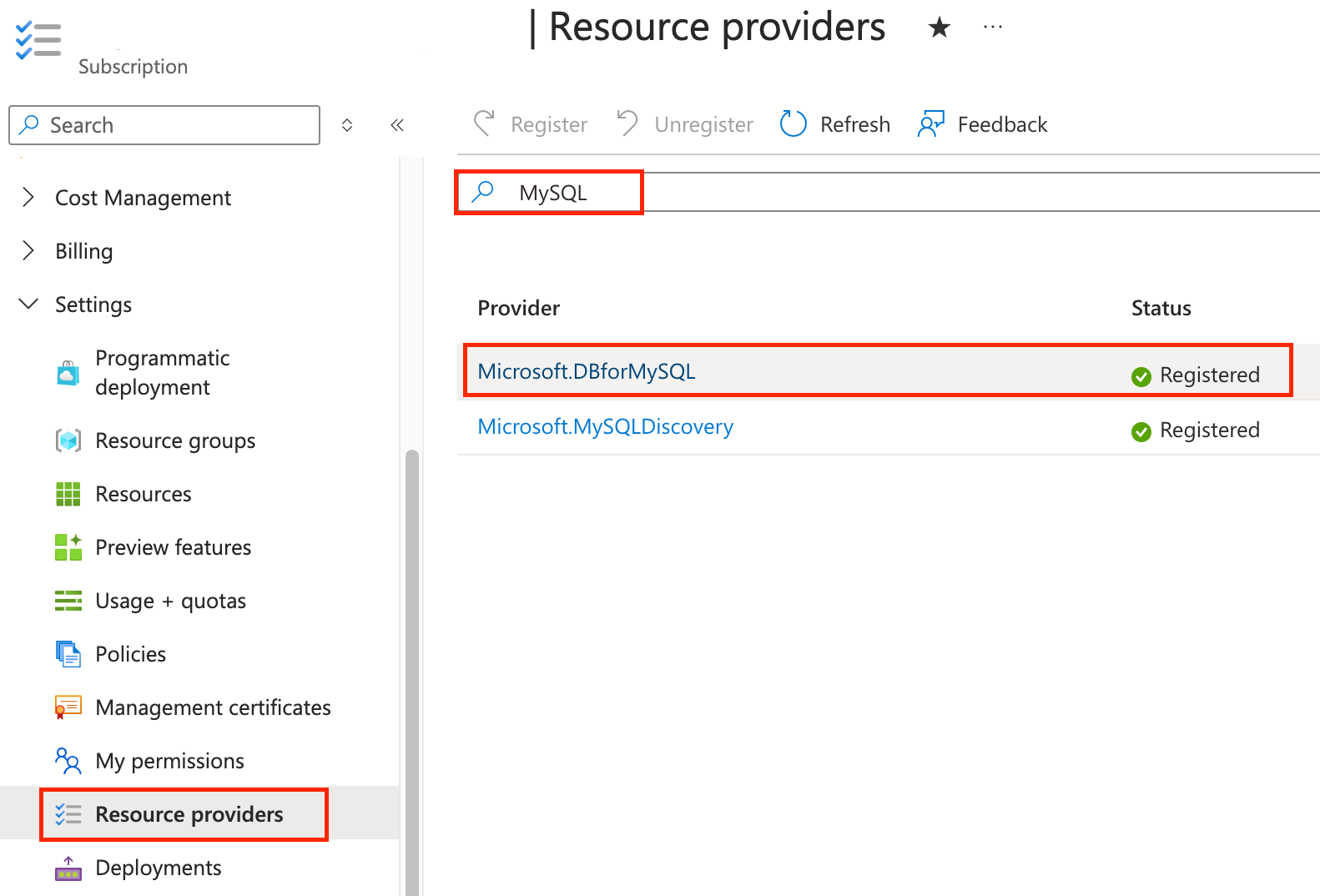 Per distribuire le risorse di Database di Azure per MySQL, registrare la sottoscrizione con il provider di risorse MySQL (RP) nel portale di Azure.