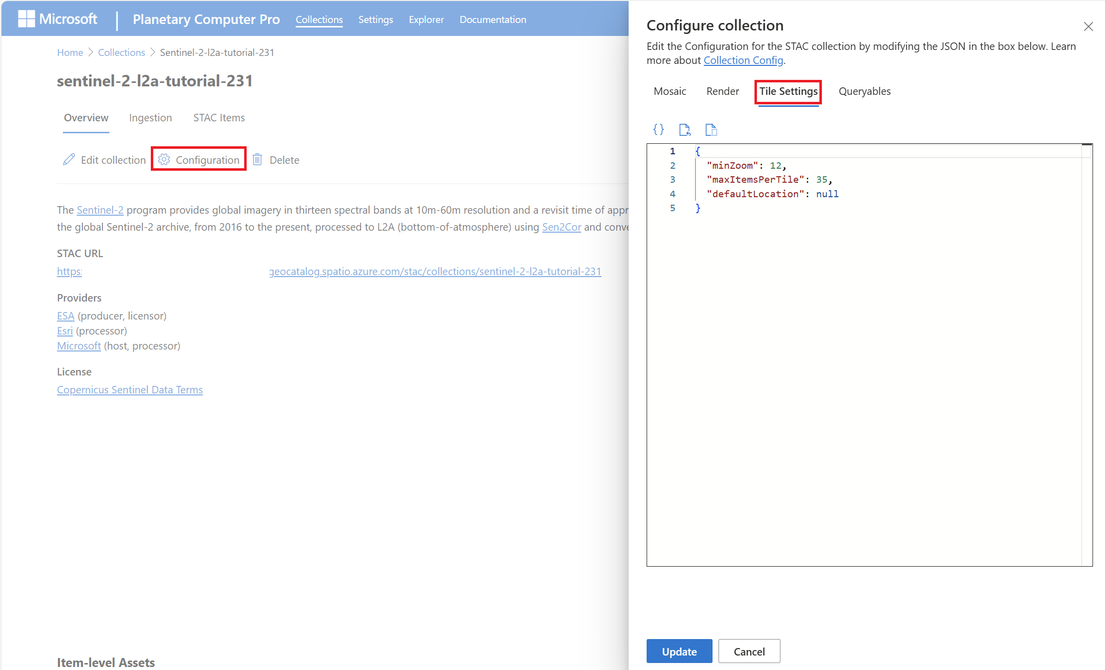 Per ogni raccolta SpatioTemporal Access Catalog (STAC) in Microsoft Planetary Computer Pro, è possibile configurare le impostazioni dei riquadri, che determinano la posizione predefinita e il livello di zoom minimo durante la visualizzazione dei mosaici in Esplora dati.
