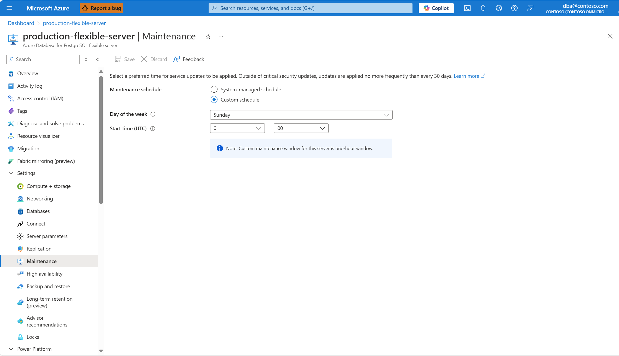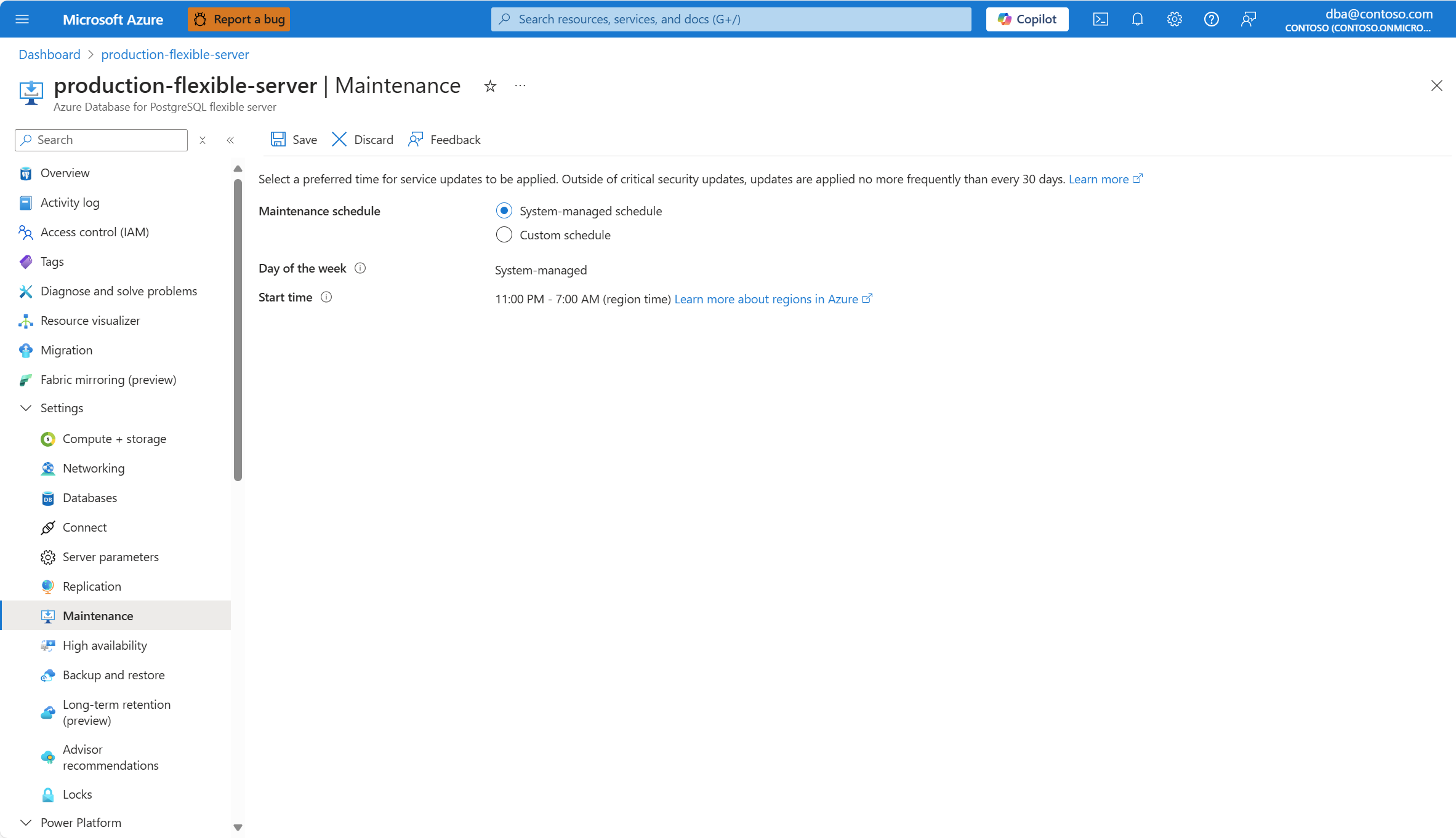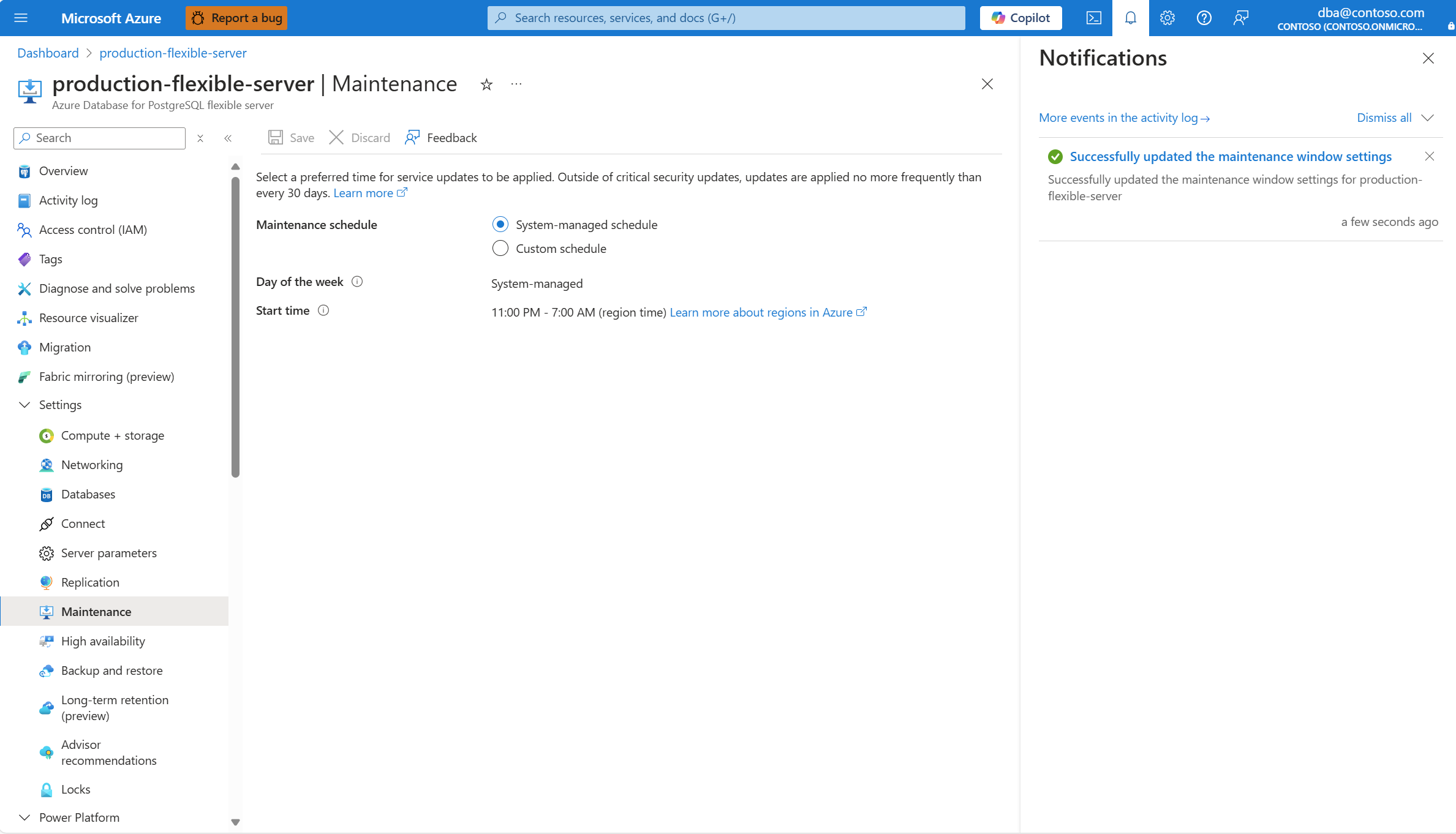 È possibile specificare le opzioni di manutenzione pianificata per ogni istanza del server flessibile di Database di Azure per PostgreSQL nella sottoscrizione di Azure. Le opzioni includono il tipo di manutenzione pianificata e impostazioni di notifica per gli eventi di manutenzione imminenti e completati.