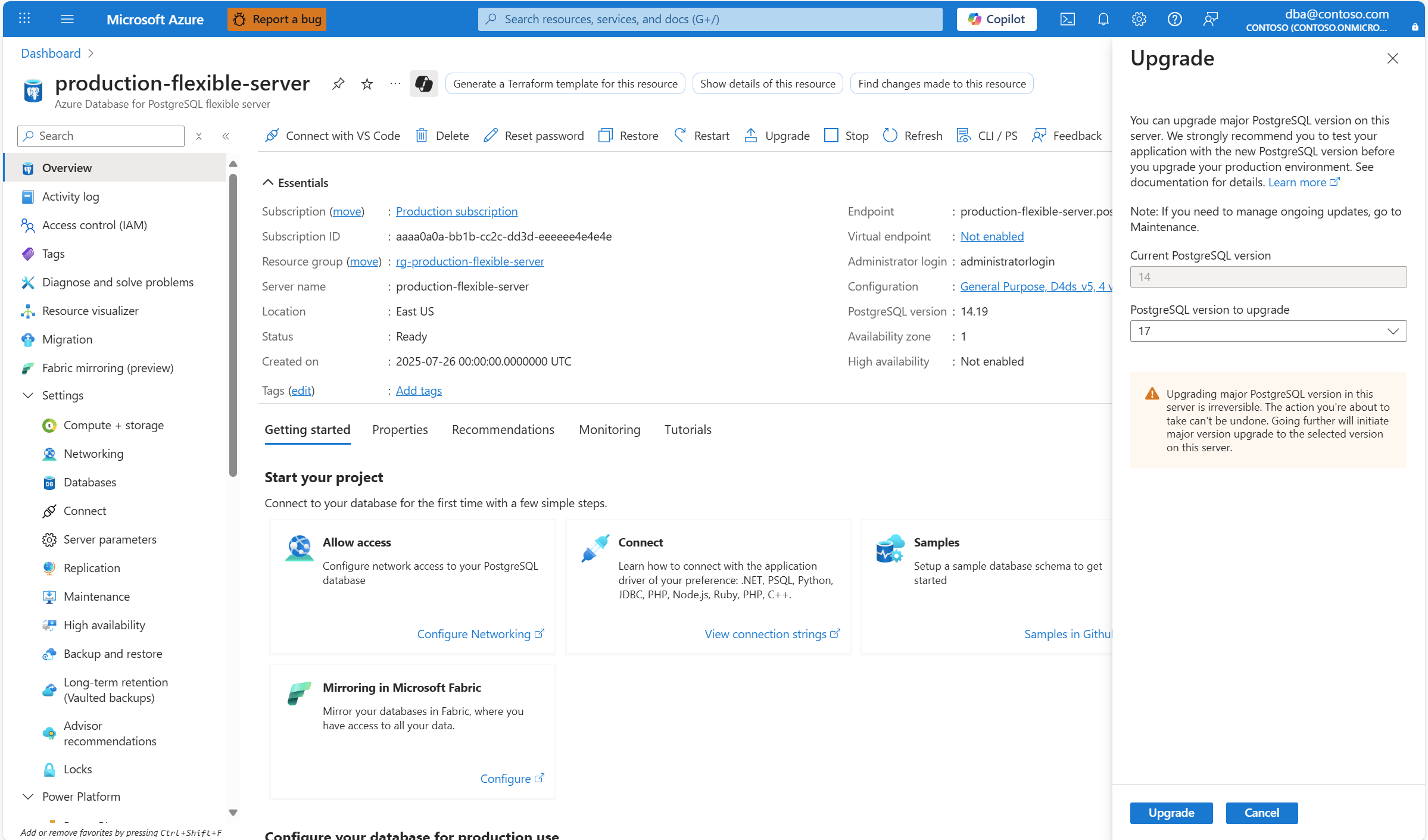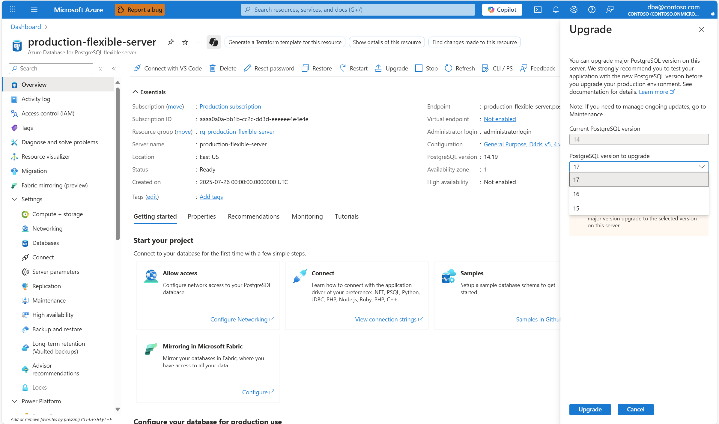Questo articolo fornisce istruzioni dettagliate per eseguire un aggiornamento della versione principale di un'istanza del server flessibile Database di Azure per PostgreSQL.