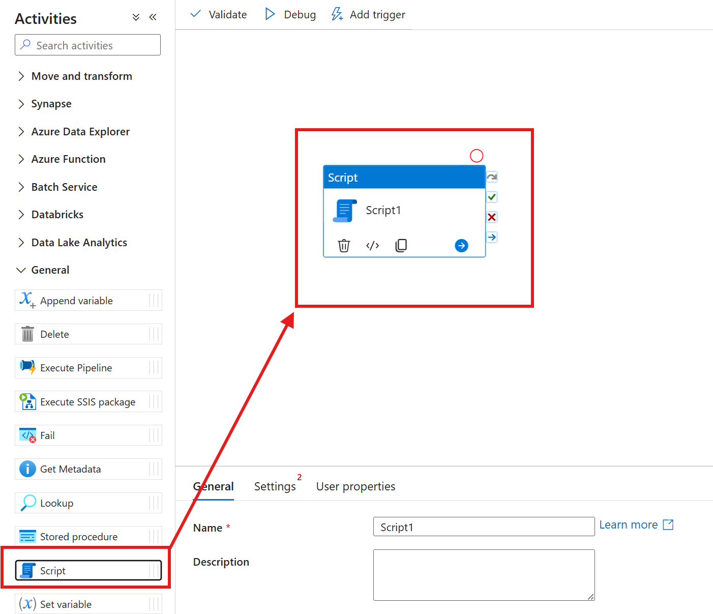 In Generale trascina e rilascia l'attività script nella pipeline.
