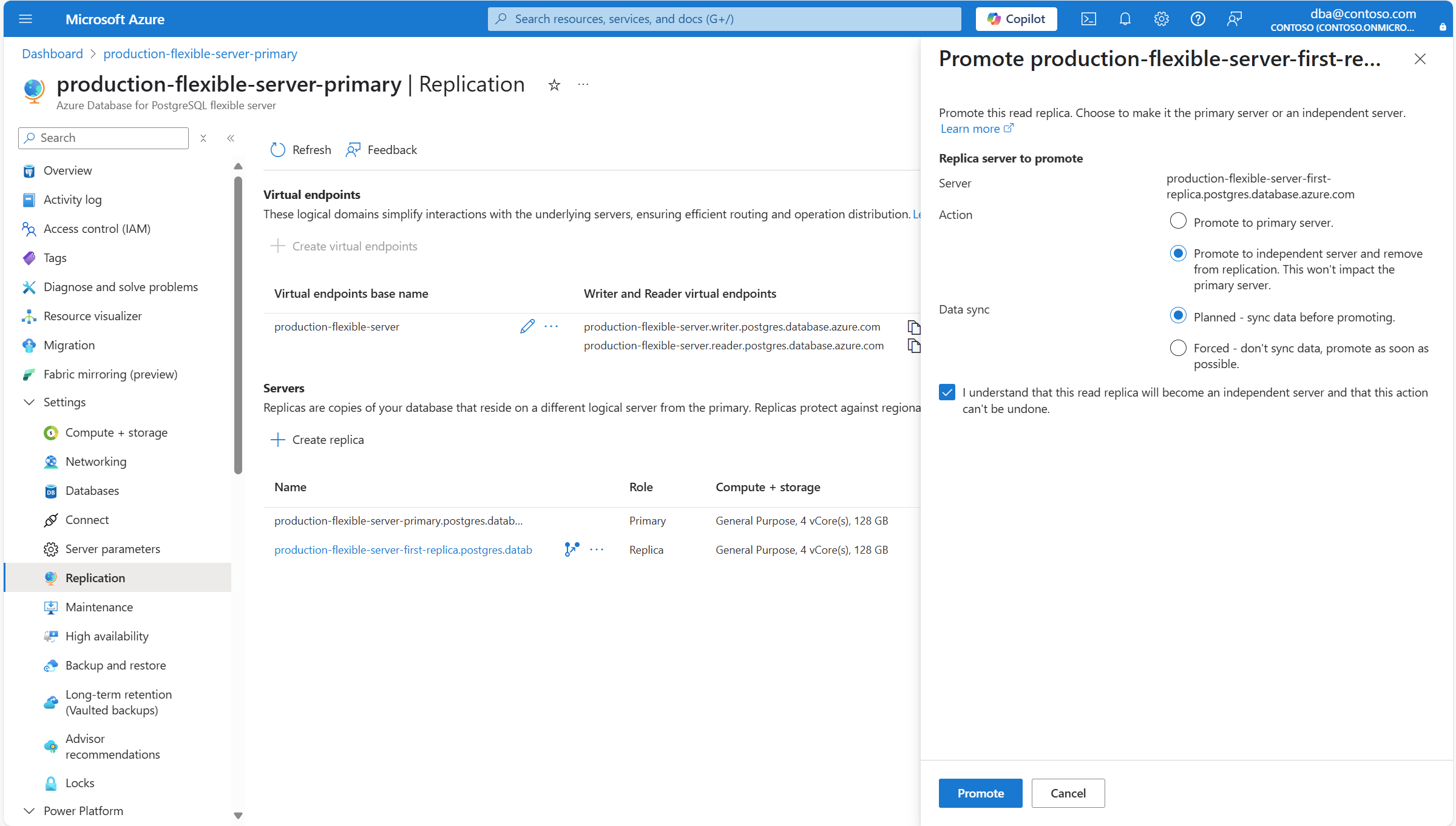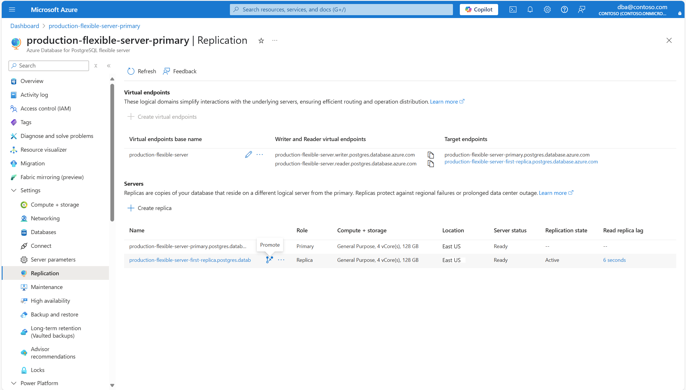 Questo articolo fornisce istruzioni dettagliate per passare a una replica di lettura di un server flessibile di Database di Azure per PostgreSQL affinché diventi il nuovo server primario del set di replica.