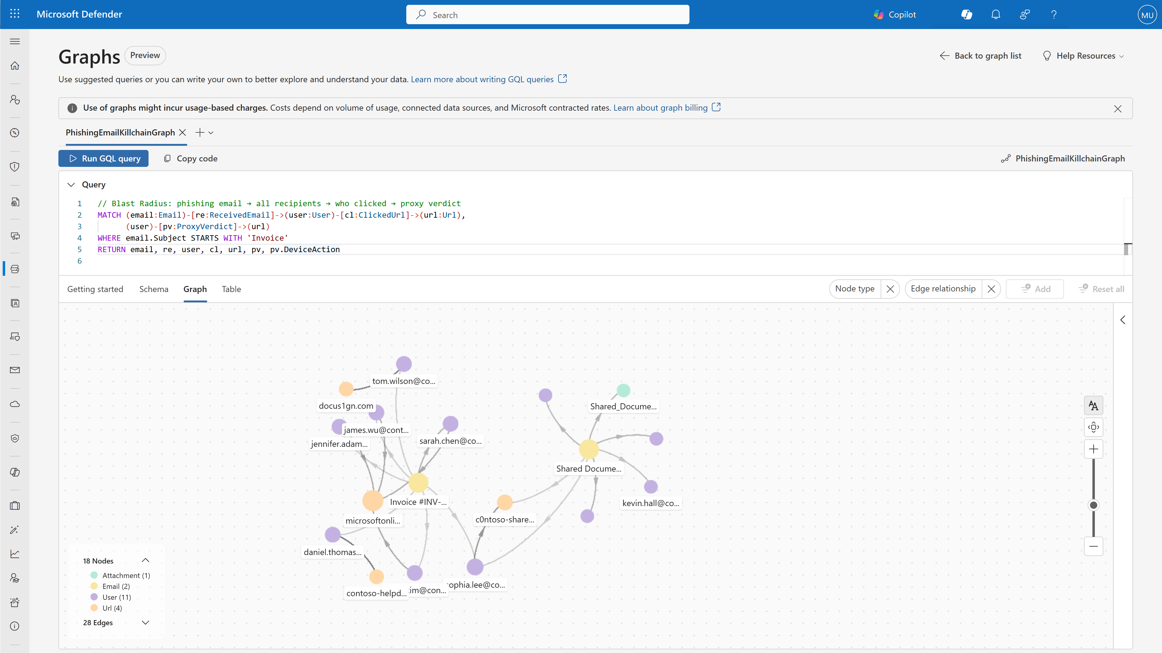 | Catena di uccisioni di posta elettronica di phishing con contesto aziendale arricchito | • Chi ha ricevuto l'e-mail di phishing, chi ha fatto clic sui collegamenti e quali clic sono stati effettivamente consentiti dal proxy? • Quali messaggi di posta elettronica puntano allo stesso URL, rivelando onde usando l'infrastruttura condivisa? Seguire l'allegato → scaricare →'esecuzione del processo → dispositivo per visualizzare la catena dalla posta in arrivo alla compromissione. |