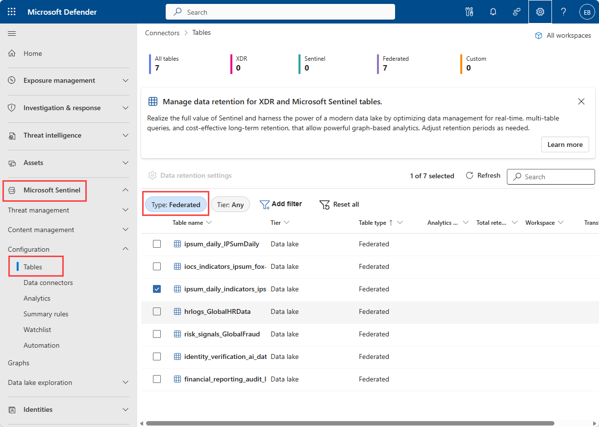La vista gestione tabelle offre una panoramica di tutte le tabelle nel data lake di Sentinel, incluse le tabelle federate.