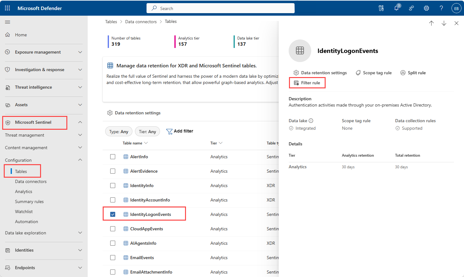 Visibilità tabella XDR: le trasformazioni di divisione e filtro applicate alle tabelle XDR non vengono visualizzate in Ricerca avanzata per i primi 30 giorni di dati. Le trasformazioni vengono applicate e, una volta che i dati superano i primi 30 giorni, si comportano normalmente in Ricerca avanzata. I dati sottoposti a query da Log Analytics o Microsoft Sentinel riflettono immediatamente i risparmi sui costi.