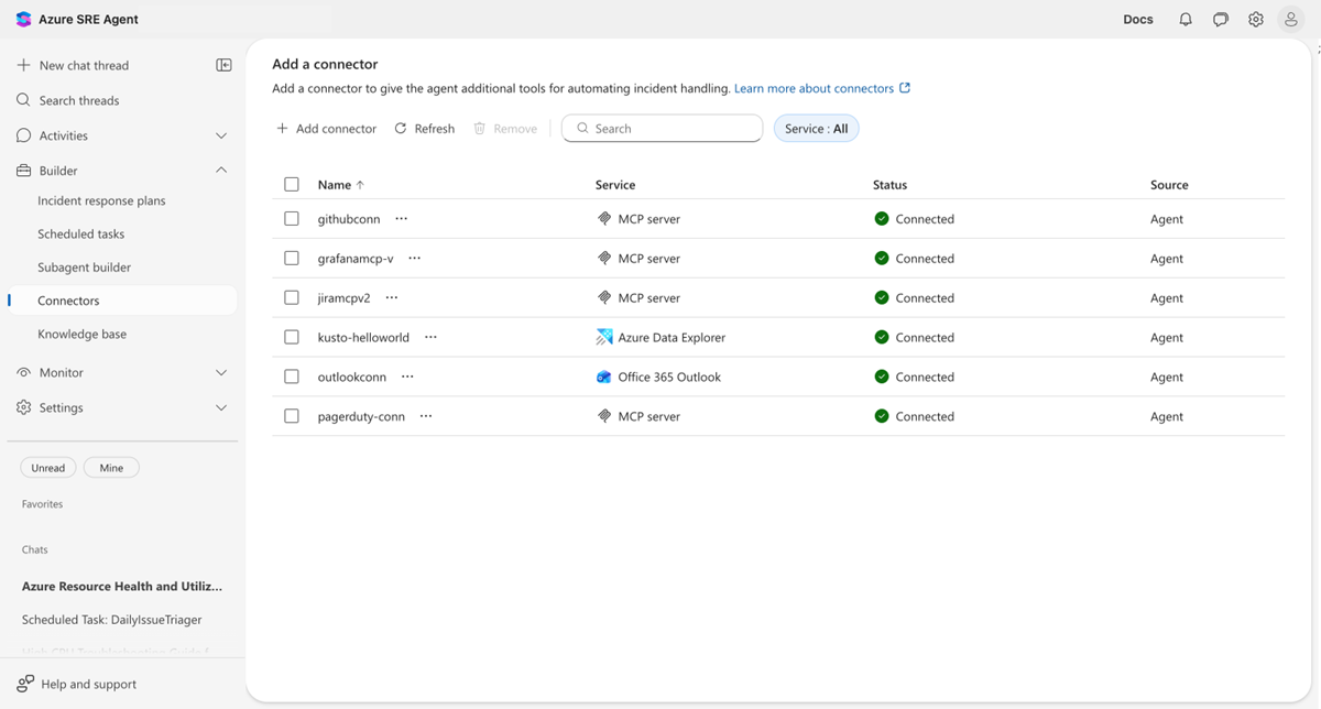 - Un agente creato nel portale dell'agente SRE di Azure