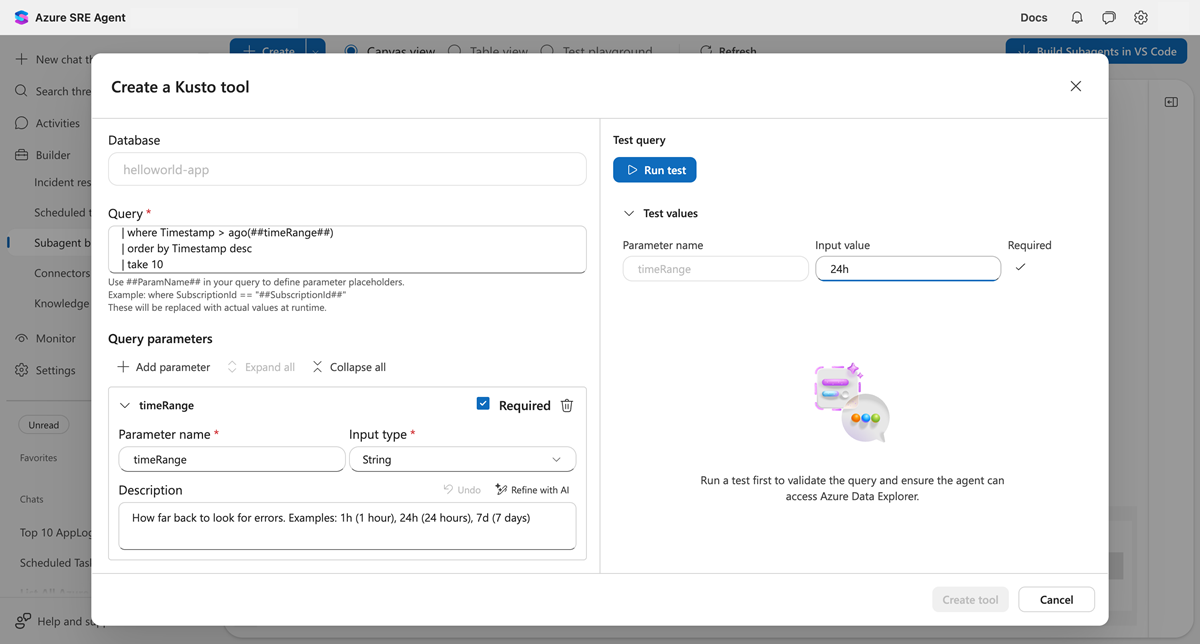 - Creare uno strumento Kusto nel generatore di subagent