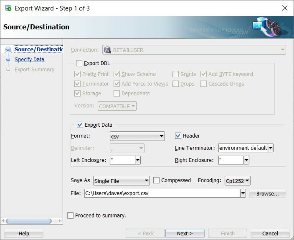 È possibile usare l'interfaccia utente di Oracle SQL Developer per esportare i dati della tabella in molti formati, tra cui CSV, come illustrato nello screenshot seguente: