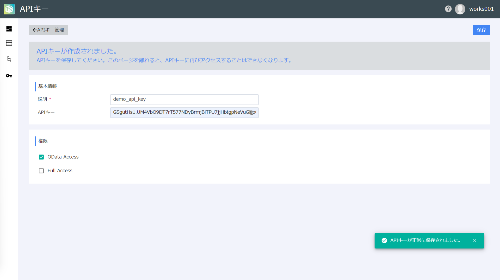 - Fare clic sul pulsante "Salva chiave API" in alto a destra della pagina per creare la chiave API desiderata.