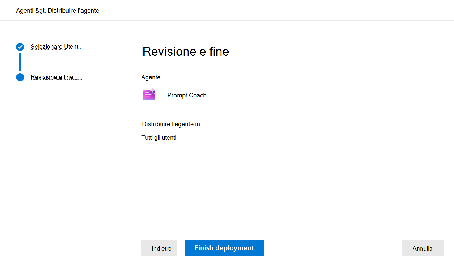 Selezionare questa opzione per assegnare l'agente in base a una delle opzioni seguenti: a. Solo io b. Intera organizzazione c. Utenti/gruppi specifici Quindi selezionare Avanti.