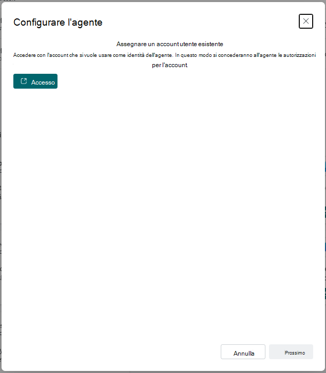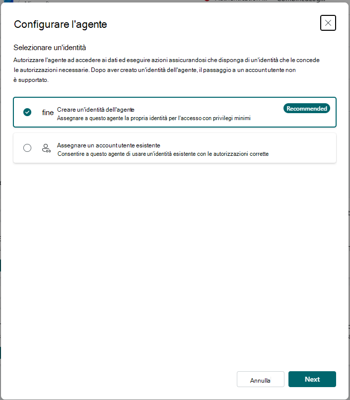 È consigliabile creare un'identità dell'agente. Per altre informazioni, vedere Che cosa sono le identità degli agenti?.