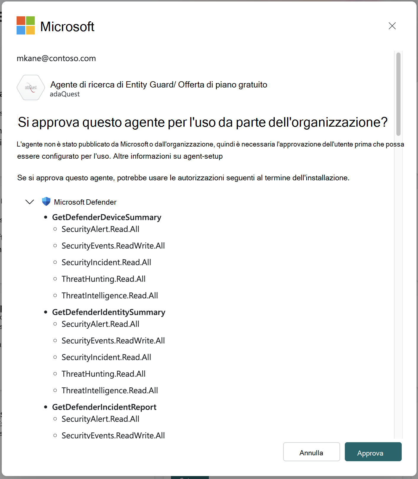 Quando si configura un agente creato dai partner che accede a uno strumento Microsoft (competenza) e accede ai dati di un prodotto Microsoft, ad esempio Microsoft Intune, Microsoft Entra, Microsoft Sentinel, Defender o Defender Threat Intelligence, un amministratore globale all'interno del tenant deve approvare per consentire l'accesso alle autorizzazioni necessarie per l'agente.