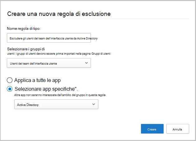 - Selezionare se si vuole applicare questa regola a tutte le app connesse o solo ad app specifiche. Se si seleziona App specifiche, Microsoft Defender for Cloud Apps interrompe il monitoraggio del gruppo selezionato solo per le app selezionate. Se si selezionano gli utenti del team dell'interfaccia utente del gruppo e Active Directory, Microsoft Defender for Cloud Apps monitora tutte le attività degli utenti ad eccezione delle attività di Active Directory eseguite dagli utenti del team dell'interfaccia utente.