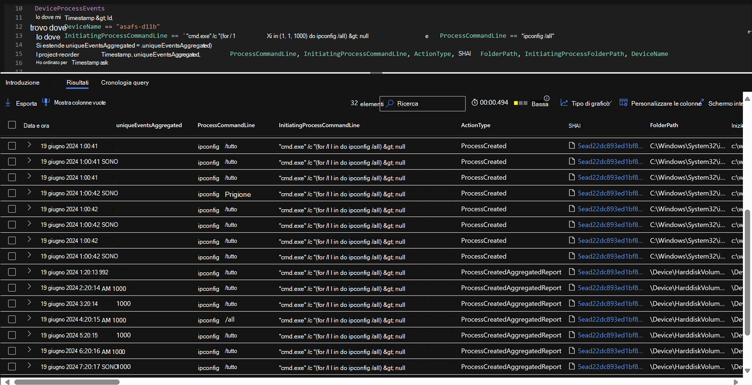 | FileCreatedAggregatedReport | DeviceFileEvents | {ProcessName} ha creato {Occorrenze} {FilePath} file | 1. Percorso del file 2. Estensione di file 3. Nome processo |