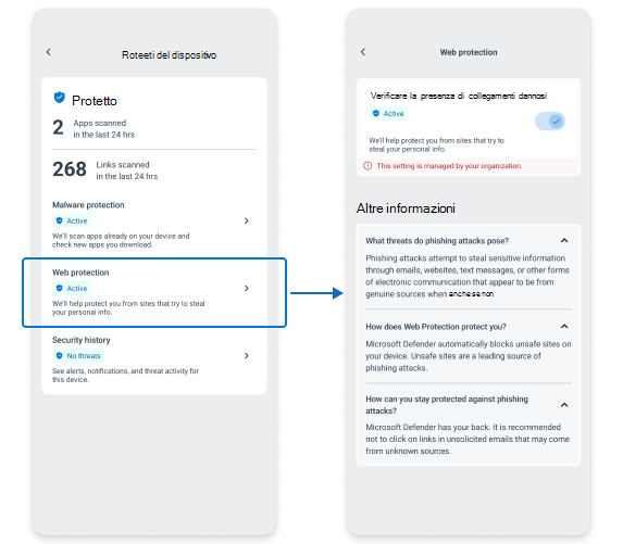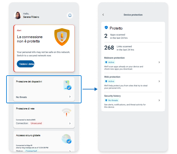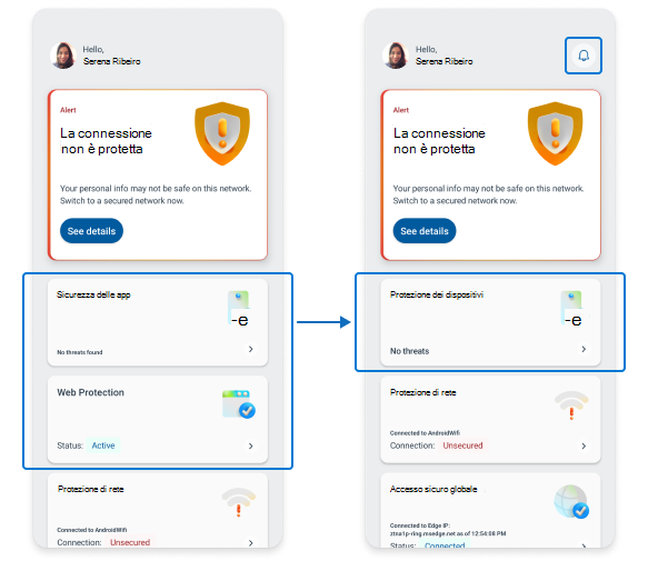 Le funzionalità Sicurezza app e Protezione Web sono ora consolidate con una singola scheda funzionalità denominata Device Protection. In precedenza, ogni funzionalità aveva una scheda separata nella schermata Dashboard. Nell'immagine seguente viene visualizzata la nuova versione della scheda funzionalità Protezione dispositivi .