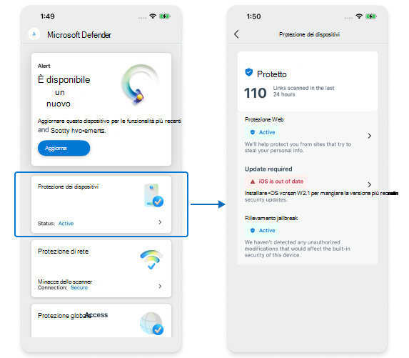 Microsoft è lieta di presentare la scheda funzionalità Protezione dispositivi per gli utenti aziendali che include la funzionalità Protezione Web, Integrità dispositivo e Jail Break, progettata per essere più intuitiva e accessibile. Le schede funzionalità aggiornate includono ora le schede di raccomandazione. La prima scheda raccomandazione visualizzerà in primo piano eventuali avvisi attivi, assicurandosi di rimanere informati. Inoltre, un elenco di funzionalità verrà ora presentato sotto forma di riquadri come parte degli schermi L2 che migliorano la facilità d'uso e la navigazione.