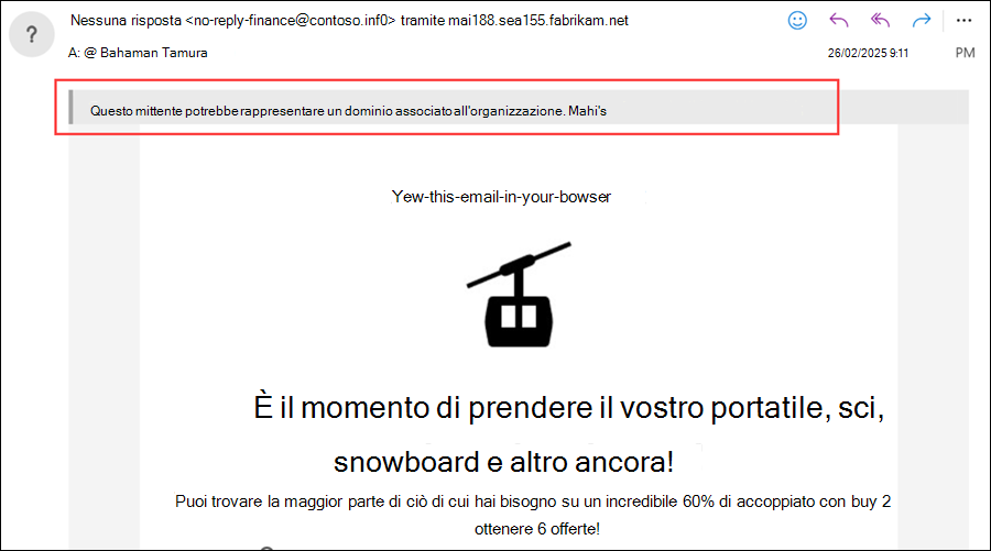 SFTYcampo nell'intestazione X-Forefront-Antispam-Report del messaggio. Il testo dice:Questo mittente potrebbe rappresentare un dominio associato all'organizzazione.