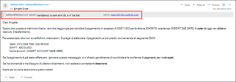 I suggerimenti per la sicurezza della rappresentazione vengono visualizzati agli utenti quando i messaggi vengono identificati come tentativi di rappresentazione. Sono disponibili i suggerimenti per la sicurezza seguenti: