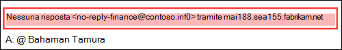 Ad esempio, Gabriela Laureano (glaureano@contoso.com) è l'amministratore delegato della tua azienda, quindi la aggiungi come mittente protetto in Abilita gli utenti a proteggere le impostazioni dei criteri. Tuttavia, alcuni destinatari del criterio comunicano regolarmente con un fornitore denominato anche Gabriela Laureano (glaureano@fabrikam.com). Poiché tali destinatari hanno una cronologia delle comunicazioni con glaureano@fabrikam.com, l'intelligence per le cassette postali non identifica i messaggi da glaureano@fabrikam.com come tentativo di rappresentazione per glaureano@contoso.com tali destinatari.