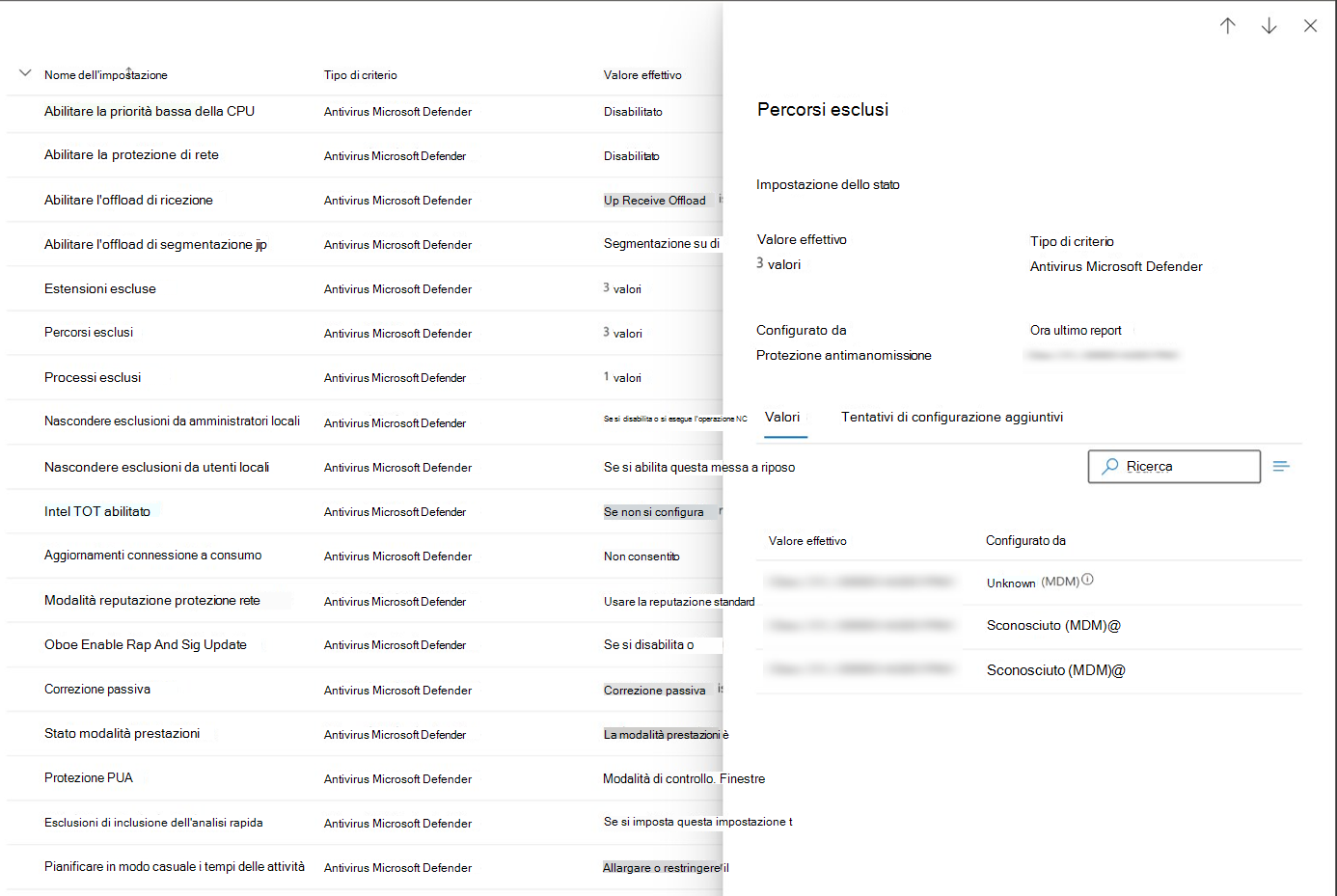 Selezionare un'impostazione per aprire un pannello laterale con altri dettagli. Viene visualizzato il valore corrente, tutti gli altri tentativi di configurazione che non sono stati applicati e, per impostazioni complesse come le regole asr o le esclusioni AV, una suddivisione di tutte le regole configurate, le relative origini ed eventuali esclusioni.