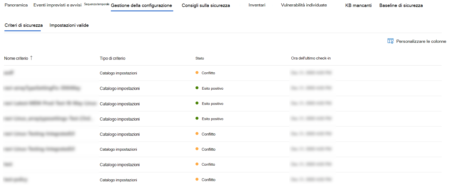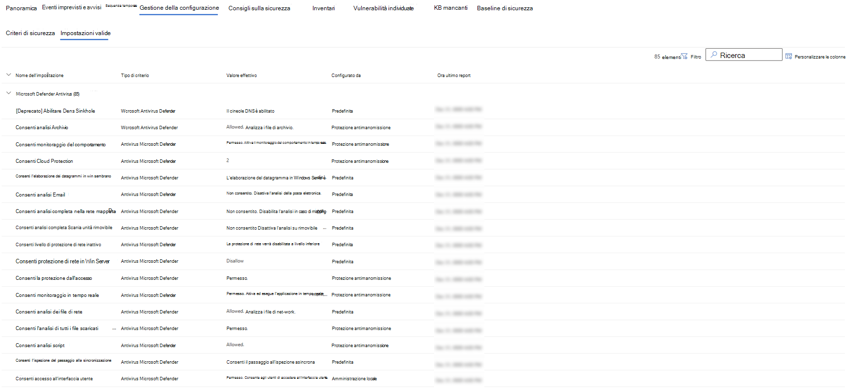 La scheda Impostazioni valide fornisce visibilità sul valore effettivo di ogni impostazione di sicurezza e identifica l'origine che l'ha configurata. Elenca i nomi delle impostazioni, i tipi di criteri, i valori effettivi, l'origine di ogni valore effettivo e l'ora dell'ultimo report.