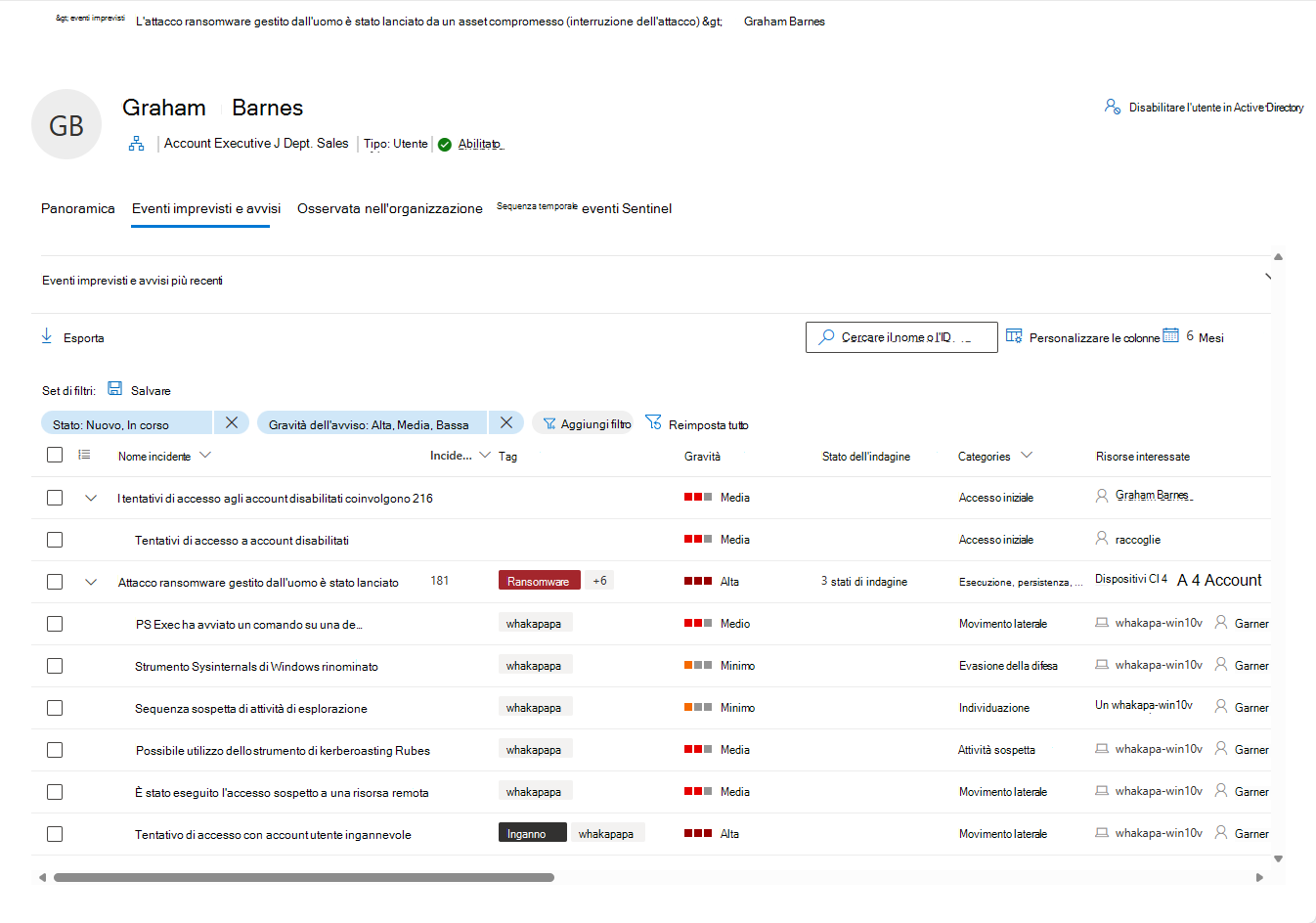 La colonna delle entità interessate si riferisce a tutte le entità utente e dispositivo a cui si fa riferimento nell'evento imprevisto o nell'avviso.