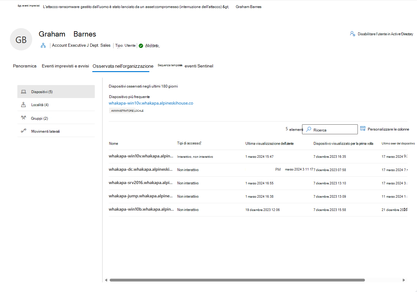 Account: questa sezione mostra tutti gli account osservati per l'entità identity, come segnalato da Microsoft Defender per identità.