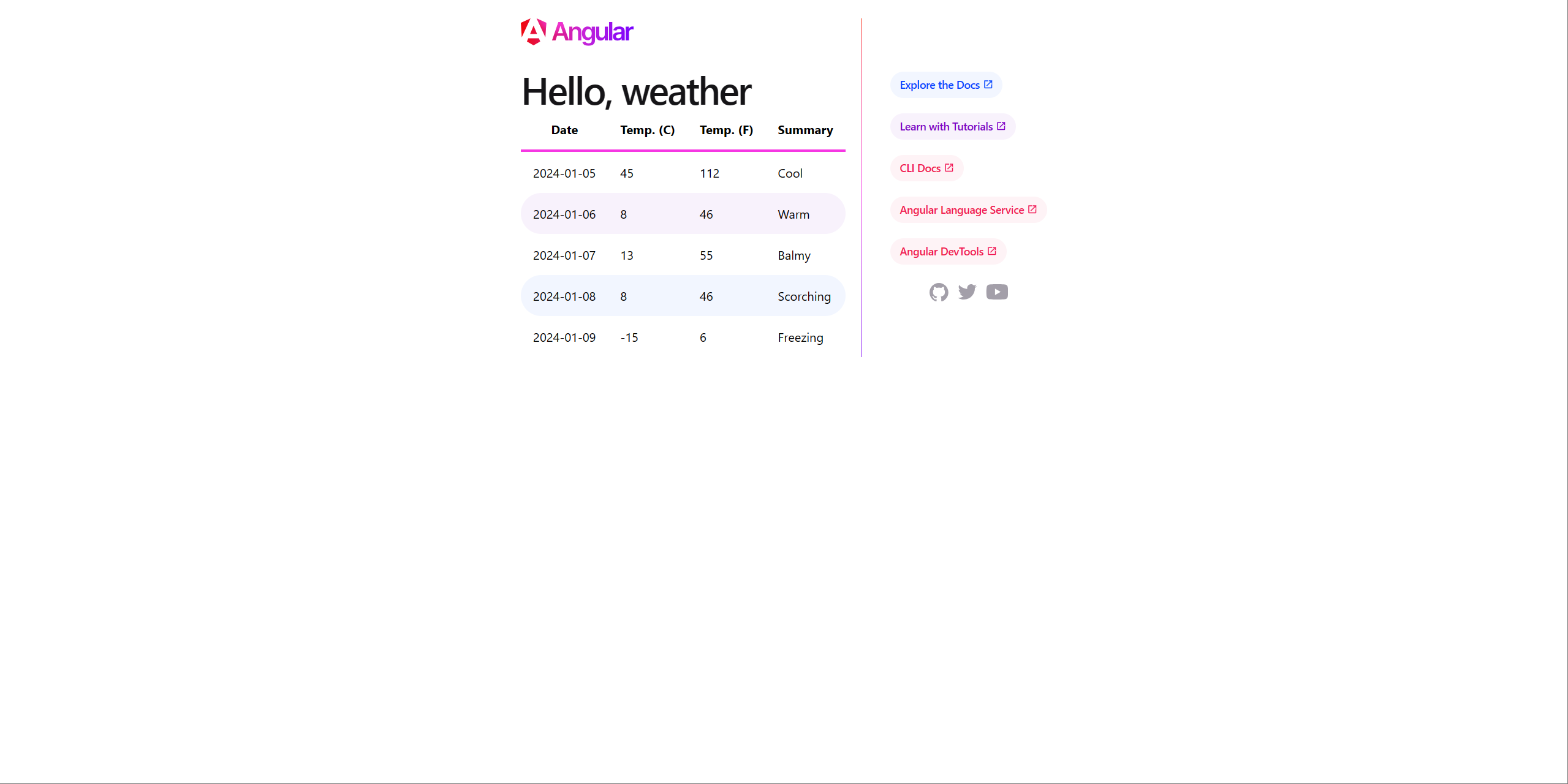 Per effettuare chiamate HTTP al servizio "weatherapi", l'app client Angular deve essere configurata per fornire il AngularHttpClient per l'iniezione delle dipendenze. Questo viene ottenuto usando la funzione helper provideHttpClient durante la configurazione dell'applicazione nel file app.config.ts.