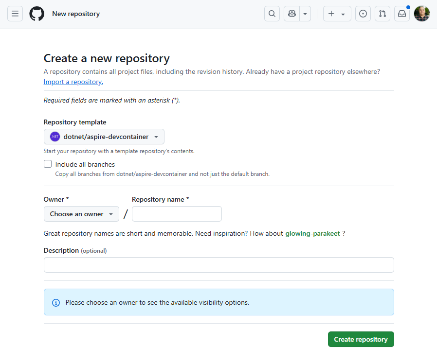 Per configurare GitHub Codespaces per Aspire, usare il file .devcontainer/devcontainer.json nel repository. Il modo più semplice per iniziare consiste nel creare un nuovo repository dal repository dei modelli. Tenere in considerazione i passaggi seguenti:
